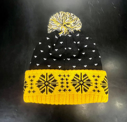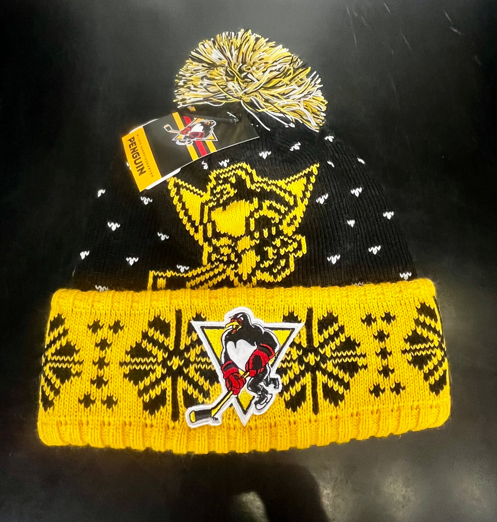 Wilkes-Barre/Scranton Penguins Pom Knit/Black/Yellow Cuff/Black-White-Yellow Pom/Sunflower Yellow Primary Logo Graphic/Embroidered Full Color Primary Logo/100% Acrylic