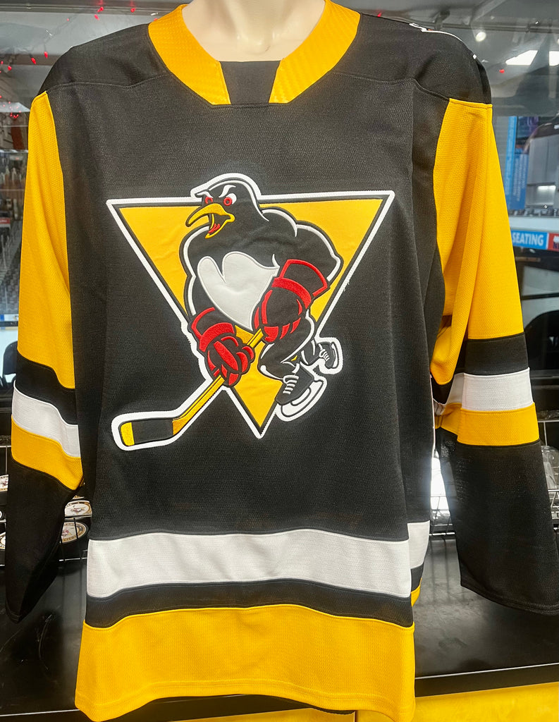 Wilkes-Barre/Scranton Penguins CCM Premier Replica Jersey/Black/Front Tackle Twill Embroidered WBS Penguins Primary Logo/Right Shoulder-WBS Penguins Primary Patch Logo & Left Shoulder- Pittsburgh Penguins Patch