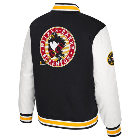 Wilkes-Barre/Scranton Penguin Original Logo Letterman Jacket/Black/PU Leather Off-White Sleeves/Black, Off-White, & Yellow Striped Cuffs & Waistband/White Snap Button/Welt Pockets/Heavyweight Vintage Fleece/Cotton/Polyester/Tackle Twill Embroidered Front & Back Hit Full Color Original Logo & Right Arm Patch Primary Logo w/ Established Date