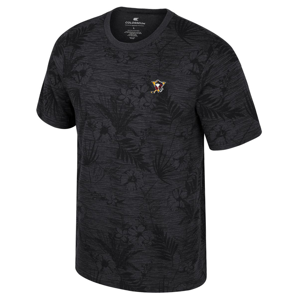 Wilkes-Barre/Scranton Penguins Tropical Short Sleeve Tee/Men's Cut/Grey-Black/Flora Graphic/Self Neck Tape/Top Left Chest Full Color Screen Printed Primary Logo/52% Cotton/48% Polyester