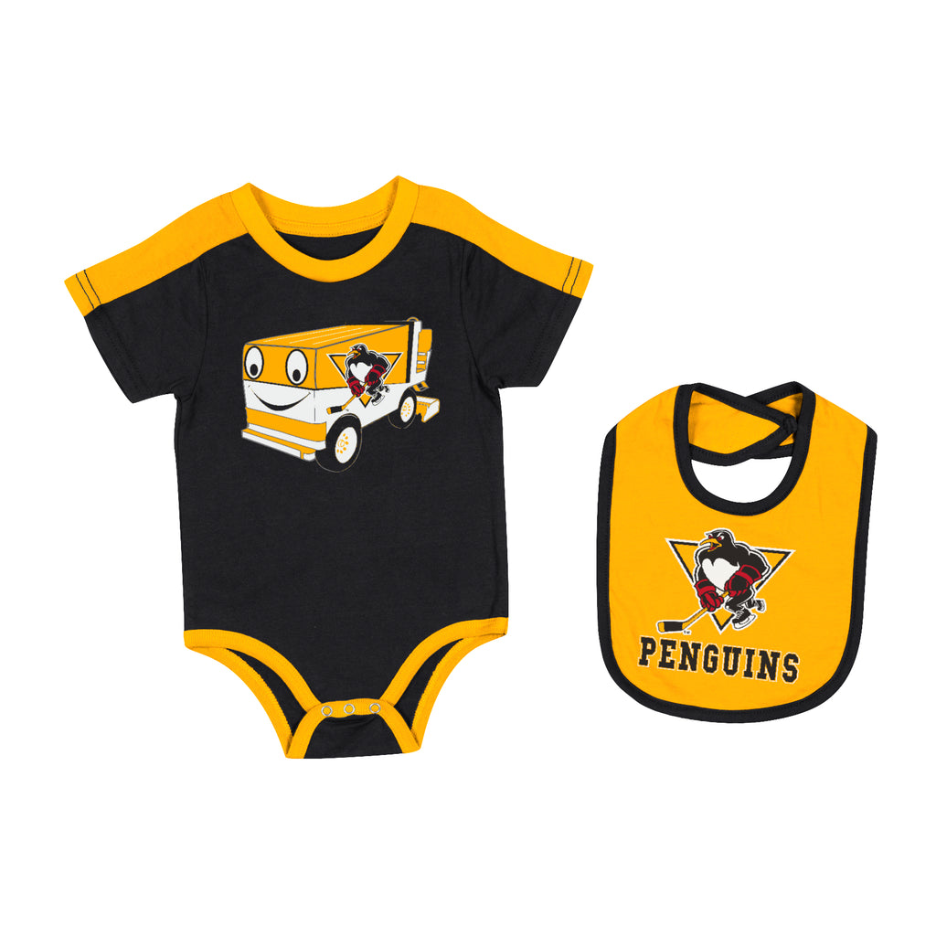 Wilkes-Barre/Scranton Penguins Infant Zamboni Onesie & Primary Logo Bib/Black Onesie Body/Yellow Yoke & Neck Tape/Screen Print-Onesie: Zamboni Graphic w/ Full Color Primary Logo, Bib-Full Color Primary Logo/Cotton-100%